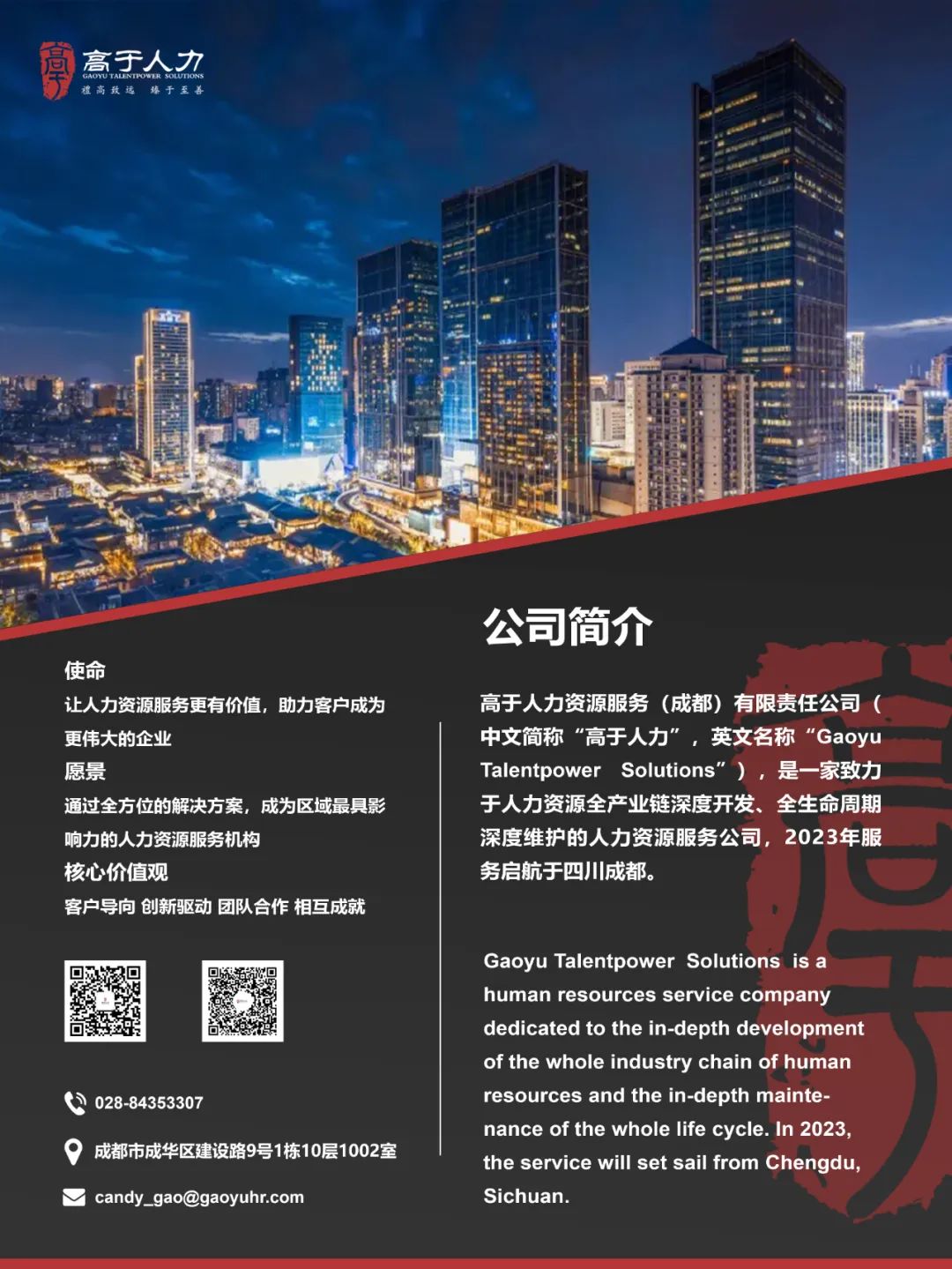高于人力资源服务(成都)有限责任公司(中文简称“高于人力”,英文全称“GaoYu Talentpower Solutions”,英文缩写:“GYTS"),是一家致力于成为“专业领先、数字驱动、全国布局”系统性人力资源服务机构。2023年服务启航于成都。