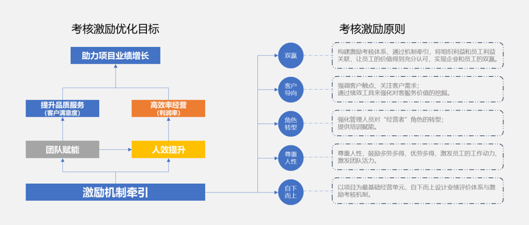 制度层面,将授权倾斜给一线管理者,明确项目责任主体、明确年度/半年/季度量化的业绩考核指标,保障满足客户需求、强化经营业绩目标和团队建设的主要指标,赋能培训员工,以促进公司整体经营目标的达成,实现企业与员工的双赢。